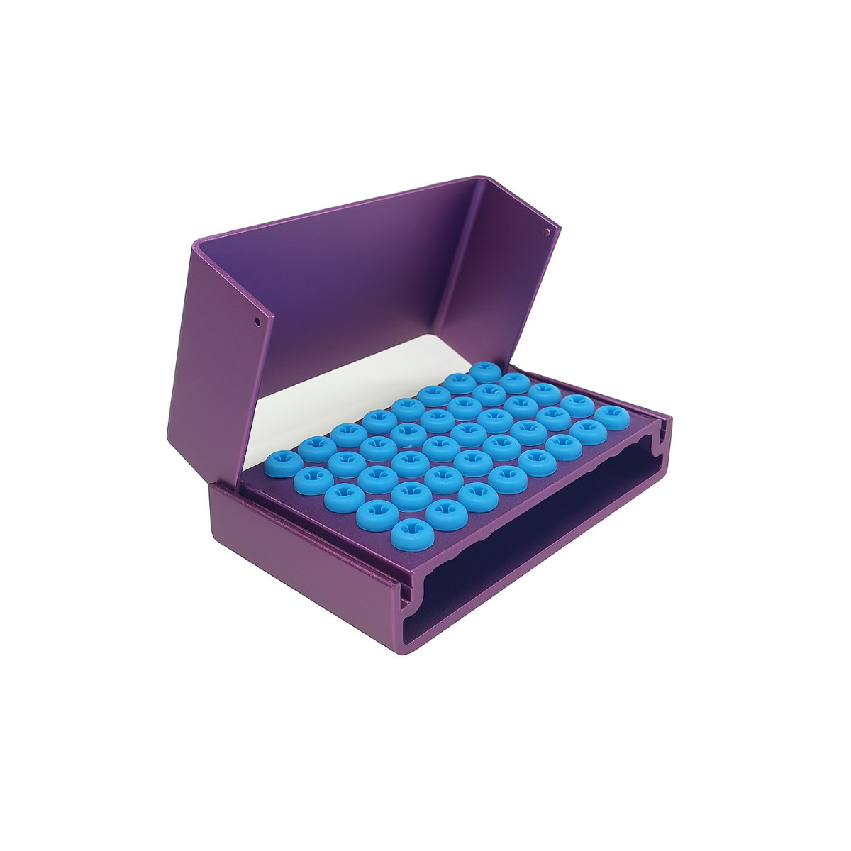Алюмінієва підставка для зберігання та стерилізації стоматологічних борів. Має 40 отворів, оснащених якісними силіконовими вставками, що надійно фіксують бори під час роботи або стерилізації.